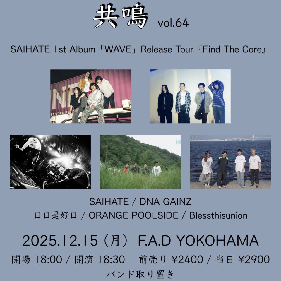 2025年12月15日(月) F.A.D YOKOHAMAにて’共鳴” vol.64 SAIHATE 1st Album 「WAVE」 Release Tour 『Find The Core』に出演決定!